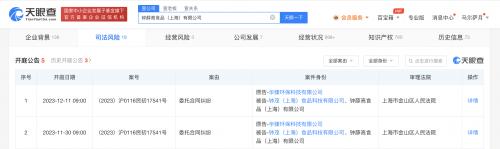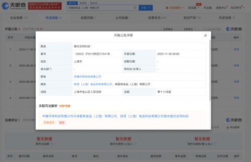 天眼查App显示,近日,钟薛高食品(上海)有限公司、钟茂(上海)食品科技有限公司因委托合同纠纷被起诉,原告为华臻环保科技有限公司,该案将于11月30日、12月11日在上海市金山区人民法院开庭审理。