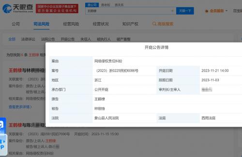 天眼查App显示,近日,王鹤棣与林某某网络侵权责任纠纷案新增开庭公告,原告为王鹤棣,案件将于11月21日在象山县人民法院开庭。
