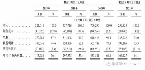 招股书显示,爱美客2018年、2019年、2020年营收分别为3.2亿元、5.58亿元、7.09亿元;毛利分别为2.8亿、5.12亿、6.49亿;毛利率分别为87.2%、91.7%、91.4%。