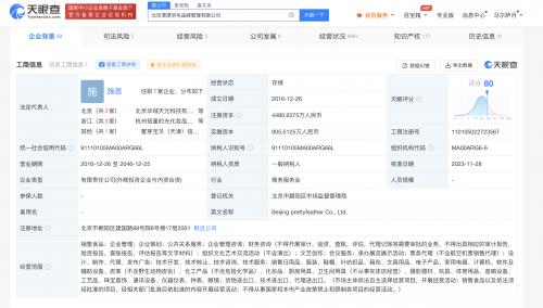 北京漂漂羽毛品牌管理有限公司成立于2016年12月,注册资本约4480.94万人民币,经营范围含销售食品、企业管理、组织文化艺术交流活动、承办展览展示活动、票务代理等。目前,该公司第一大股东为蜜芽宝贝(天津)信息技术有限公司,持股约70.3%,章子怡名下共青城大脚投资合伙企业(有限合伙)为第二大股东,持股约24%。