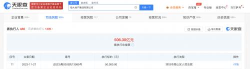 风险信息显示,恒大地产集团有限公司存在480余条被执行人信息,被执行总金额超506亿元,此外还存在多条限制消费令、失信被执行人(老赖)和终本案件信息。
