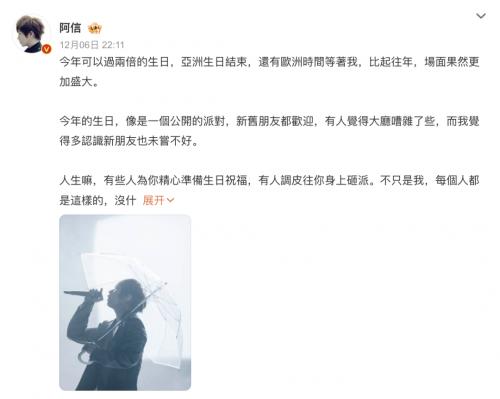 6日晚,五月天主唱@阿信发长文回应假唱风波:「每次的嘶吼,每一场,每一声,都来自于我依赖了24年的嗓子。除了真唱,否则没有其他感动你的方式」。