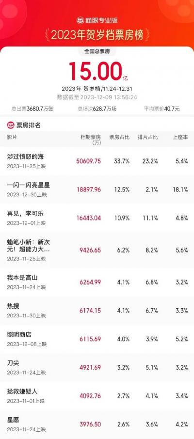 据猫眼专业版数据,截至12月9日13时56分,2023年贺岁档(11月24-12月31日)总票房(含预售)破15亿。《涉过愤怒的海》《一闪一闪亮星星》《再见,李可乐》分列贺岁档票房榜前三。