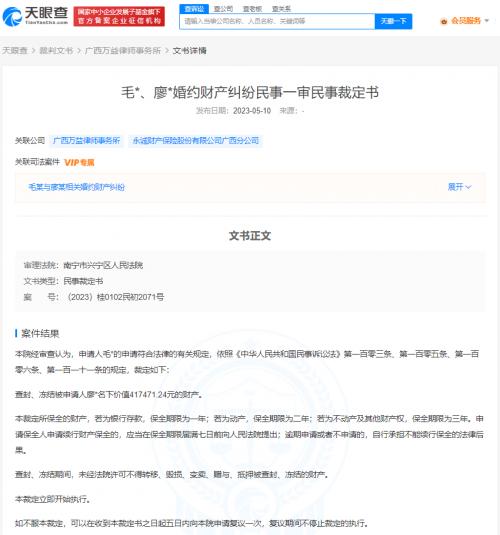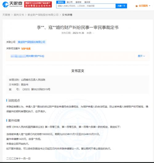 天眼查App显示,彩礼纠纷引发的诉讼案件频发。近日,山西一法院公开的李某某、寇某某婚约财产纠纷民事裁定书显示,因婚约财产纠纷,李某某申请对寇某某进行财产保全,法院审查认为该申请符合法律规定,裁定冻结寇某某银行存款18万元或相应价值财产。此外,相关案件民事裁定书显示,自然人廖某、王某今年也曾因婚约财产纠纷,被分别冻结41.7万余元、23.9万余元财产。