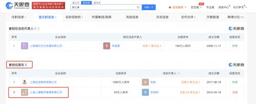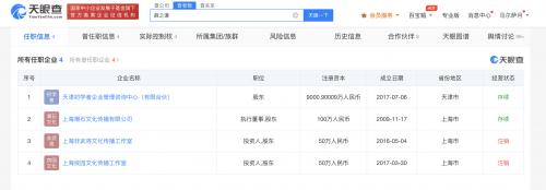天眼查App显示,薛之谦名下有两家公司为存续状态,分别为上海潮石文化传播有限公司、天津初学者企业管理咨询中心(有限合伙),另外两家公司上海非武将文化传播工作室、上海良园文化传播工作室均于2019年注销。