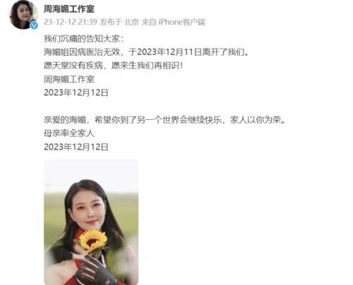 据周海媚工作室消息,香港演员周海媚因病医治无效,于2023年12月11日去世。