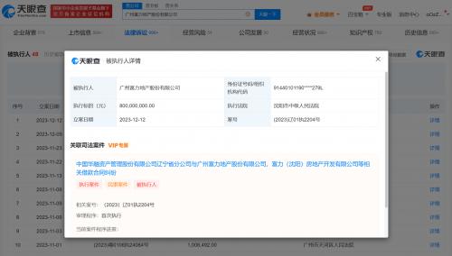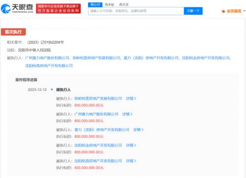 天眼查App显示,近日,富力地产(HK.02777)及富力(沈阳)房地产开发有限公司、铁岭恒莲房地产发展有限公司等新增一则被执行人信息,执行标的8亿元,涉及借款合同纠纷案件,执行法院为沈阳市中级人民法院。