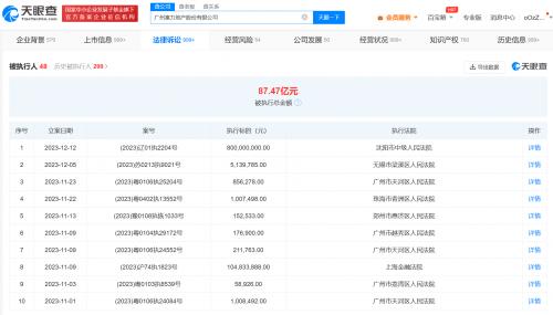 风险信息显示,目前,广州富力地产股份有限公司存在40余条被执行人信息,被执行总金额超87亿元。此外,该公司还存在限制消费令、失信被执行人(老赖)和终本案件信息。