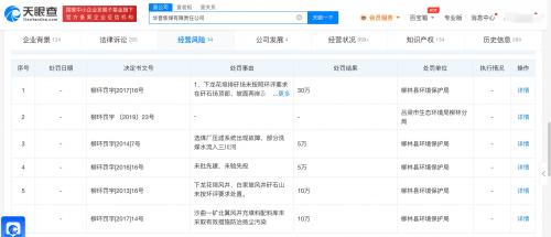风险信息显示,该公司存在多条环保处罚信息,处罚事由包括未批先建、未采取有效措施防治扬尘污染、未按照环评要求建设排水沟等,处罚总金额达60万元。