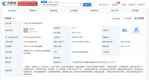 天眼查App显示,近日,上海上汽环宇商贸有限公司成立,法定代表人为赵爱民,注册资本2亿人民币,经营范围含货物进出口、技术进出口、社会经济咨询服务、国内贸易代理、汽车零配件批发、汽车销售、海上国际货物运输代理、航空国际货物运输代理、从事内地与港澳间集装箱船、普通货船运输等。股权全景穿透图显示,该公司由上汽集团(600104)旗下上海汽车国际商贸有限公司全资持股。