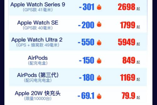 此外,Apple产品京东超级品牌日还有Apple Watch、AirPods等产品优惠可享。其中,Apple Watch Series 9 GPS款41毫米版京东价2698元;Apple Watch SE GPS款40毫米版京东价1799元;Apple Watch Ultra 2 GPS+蜂窝款49毫米版京东价5949元。此外,AirPods配充电盒版京东价849元,AirPods(第三代)配闪电充电盒版京东价1169元;Apple 20W快充头限时限量享优惠,京东价79.9元。