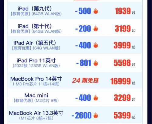 Apple产品京东超级品牌日也是入手iPad和Mac产品的好时机,iPad(第九代)64GB WLAN教育优惠版限时优惠500元,iPad(第十代)64G WLAN教育优惠版限时优惠200元,iPad Air(第五代)64G WLAN版教育优惠版限时优惠400元,iPad Pro 11英寸2022款128G WLAN版限时优惠801元。MacBook Air 13.3英寸M1芯片8核+7核限时优惠2600元,Mac mini M2芯片8核教育优惠版限时优惠400元,MacBook Pro 14英寸M3 Pro芯片11核+14核可享24期免息。