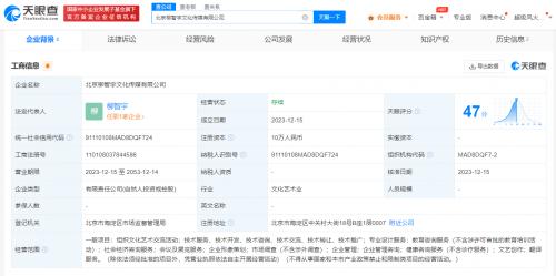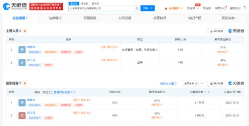天眼查App显示,近日,北京柳智宇文化传媒有限公司成立,法定代表人、执行董事、经理均为柳智宇,注册资本10万人民币,经营范围包括教育咨询服务、社会经济咨询服务、健康咨询服务、组织文化艺术交流活动、翻译服务等。股东信息显示,该公司由柳智宇、吴玉芳分别持股51%、49%。