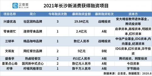企查查数据显示,2021年1-7月,长沙共有7个新消费项目获得12次融资,其中社区团购品牌“兴盛优选”无疑夺得榜首,融资3次,腾讯投资两次参投。而在5月份,长沙本土热卤品牌“盛香亭”获得腾讯入股,据《每日经济新闻》消息,腾讯此次以数千万元的代价获得了约10%的股份。