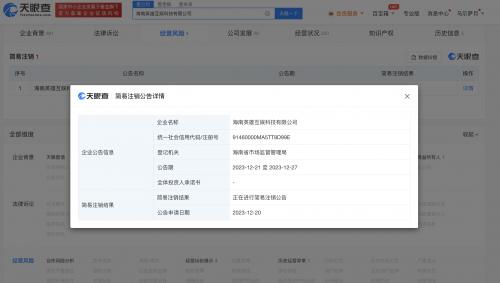 天眼查App显示,近日,海南英雄互娱科技有限公司新增简易注销公告,公告期自2023年12月21日至12月27日。该公司成立于2020年12月,注册资本200万人民币,法定代表人、执行董事兼总经理为英雄游戏CEO吴旦,由英雄游戏科技股份有限公司全资持股。
