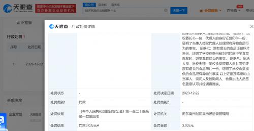 天眼查App显示,近日,剑河民高供应链服务中心因提供的食品混有异物,被黔东南州剑河县市场监督管理局罚款3万元。