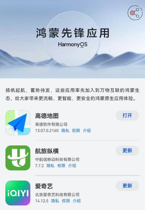 鸿蒙先锋应用专区正式上线华为商店,其中包括高德地图、QQ音乐、爱奇艺、抖音、360手机浏览器、支付宝等,目前大概有150款。