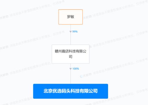天眼查App显示,近日,北京优选码头科技有限公司成立,法定代表人为吕连柱,注册资本8000万人民币,经营范围含互联网销售、新鲜蔬菜零售、食用农产品批发、日用品批发、服装服饰零售、市场营销策划等。股权全景穿透图显示,该公司由赣州趣店科技有限公司全资持股,后者由罗敏持股99%。