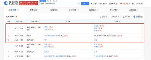天眼查App显示,不久前,北京懂车帝科技有限公司发生工商变更,法定代表人由李飞变更为马骏,全资股东今日头条有限公司退出,新增厦门懂车族科技有限公司为股东并全资持股。后者成立于2023年12月,法定代表人为黄艳玲,注册资本100万人民币,由何戬、赵静共同持股。不过,作为懂车帝主体公司的北京空间变换科技有限公司,其股东并未发生变化,目前仍由今日头条有限公司全资持股。