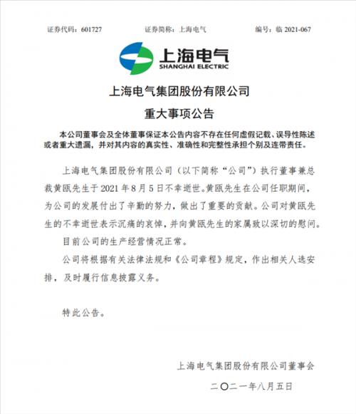 上海电气官方于8月5日晚间发布公告,确认黄瓯于8月5日不幸逝世,但未透露具体原因,只是强调公司生产经营情况正常。