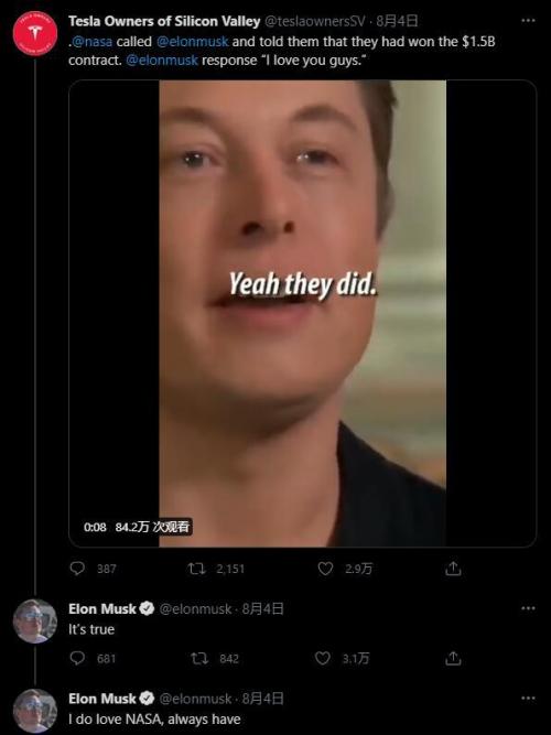 这段视频的点击量已经超过22万次。马斯克在对这条推文回应时写道:“这的确是真的!”在随后的推文中,他又写道:“我真的很爱NASA,而且始终都是如此。我只想对那些政府官员说声谢谢,他们不顾极大的压力,努力争取确保正确的事情发生。”