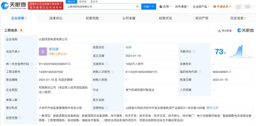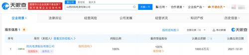 天眼查App显示,近日,山西同阳电源有限公司成立,法定代表人为李双建,注册资本1000万人民币,经营范围含新能源原动设备制造、新能源原动设备销售、电力设施器材制造、工程管理服务、电池销售、储能技术服务等。股东信息显示,该公司由阳光电源(300274)全资持股。
