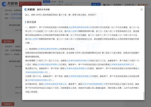 相关文书显示,北京泰和友联投资有限公司曾出资6000万元对李亚鹏兄弟二人公司(丽江雪山投资有限责任公司)进行注资,并约定获得雪山公司10%的股份,项目3年开发周期届满后由泰和友联公司先行收回约定的固定权益收益4000万元。因李亚鹏一方一直未支付相关款项,泰和友联公司将李亚鹏、李亚炜和担保公司诉至法院,法院一审判决李亚鹏、李亚炜向泰和友联公司支付4000万元及利息。