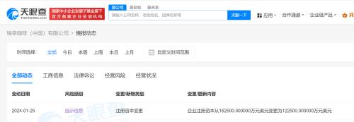 天眼查App显示,近日,瑞幸咖啡(中国)有限公司发生工商变更,注册资本由16.25亿美元减至12.25亿美元。