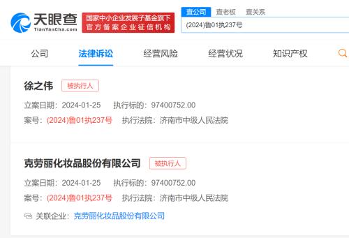 天眼查App显示,近日,克劳丽化妆品股份有限公司、徐之伟新增一则被执行人信息,执行标的9740万余元,执行法院为济南市中级人民法院。