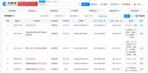 天眼查App显示,苹果公司已申请40余项头戴式显示器相关专利,包括“用于头戴式显示器的光学系统”“具有触觉输出的头戴式显示器”“具有低光操作的头戴式显示器”“头戴式显示器、用于头戴式显示器的面部界面和显示系统”等,部分专利已经获得授权。此外,2023年6月、8月,苹果公司曾申请注册多枚“VISION PRO”商标,国际分类为服装鞋帽、健身器材等,当前商标状态多为等待实质审查。