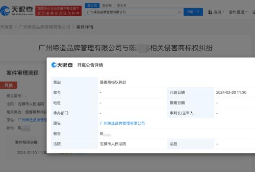 天眼查App显示,近日,广州缔造品牌管理有限公司与陈某某侵害商标权纠纷案件新增开庭公告信息,原告为广州缔造品牌管理有限公司,该案将于2月20日在石狮市人民法院开庭审理。