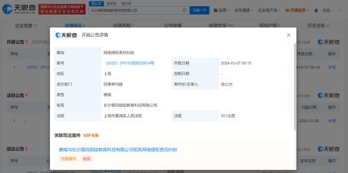 天眼查App显示,近日,唐嫣与长沙蛋妈陪娃教育科技有限公司相关网络侵权责任纠纷案件新增开庭公告,原告为唐嫣,该案将于3月7日在上海市黄浦区人民法院开庭审理。