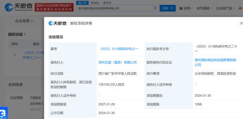 天眼查App显示,近日,深圳正威(集团)有限公司新增一则股权冻结信息,被冻结股权数额10.51亿人民币,股权被执行的企业为贵州国际商品供应链管理有限公司,冻结期限自2024年1月30日至2027年1月29日,执行法院为四川省广安市中级人民法院。
