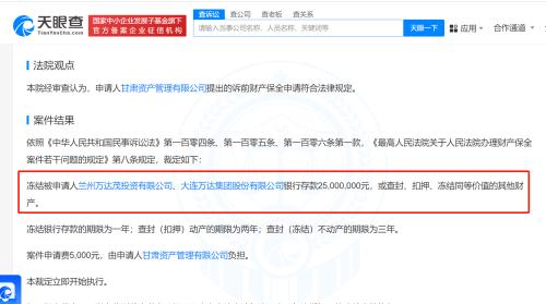 文书显示,甘肃资产管理有限公司于2023年12月向法院申请诉前财产保全,请求冻结兰州万达茂投资有限公司、大连万达集团股份有限公司银行存款2500万元,或查封、扣押、冻结相应价值的其他财产。法院经审查认为该申请符合法律规定,裁定执行。