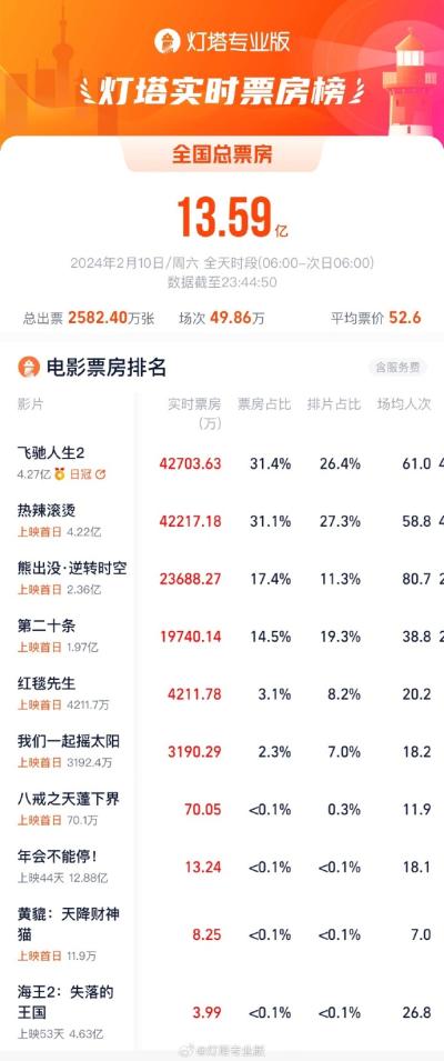灯塔专业版公布了2024年春节档首日数据:当日全国票房达13.59亿,超过去年春节档首日13.58亿。