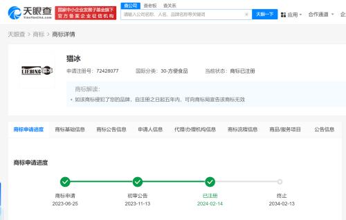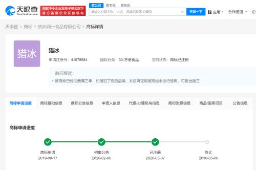 天眼查App显示,“猎冰”已被申请注册为商标,国际分类涉及方便食品、餐饮住宿、啤酒饮料,申请人为杭州某食品公司和自然人龙某某,当前商标状态均为已注册。