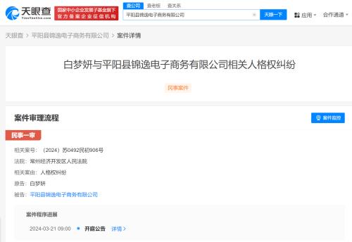 天眼查法律诉讼信息显示,近日,白梦妍(白鹿)与平阳县锦逸电子商务有限公司相关人格权纠纷一案新增开庭公告,原告为白梦妍,该案将于3月21日在常州经济开发区人民法院开庭审理。