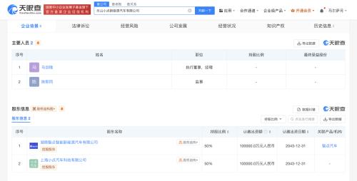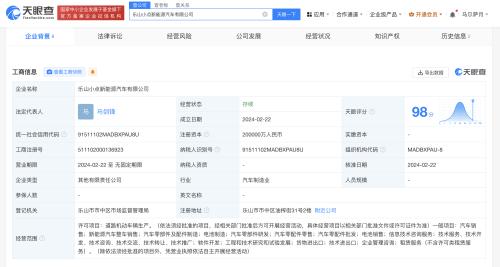 天眼查App显示,2月22日,乐山小点新能源汽车有限公司成立,法定代表人为马剑锋,注册资本20亿人民币,经营范围含道路机动车辆生产、新能源汽车整车销售、电池制造、工程和技术研究和试验发展、货物进出口、企业管理咨询等。股东信息显示,该公司由湖南智点智能新能源汽车有限公司及旗下上海小点汽车科技有限公司共同持股。