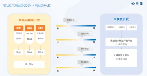 从L0到L1再到L2,整个大模型由“通”到“专”,并且提升了模型的通用型和泛化能力,既能够大幅减少用户训练模型的研发成本,且降低了AI落地应用的门槛。与传统的小模型开发相比,得益于大模型具有较强的通用型、泛化性,用户仅需少量样本、较少开发时间即可研制出面向所需场景的应用模型,因此降低了对第三方算法厂家的依赖,对于模型的应用可以自主持续演进,从而拥有更强的自主研发能力,提高模型对业务的赋能。