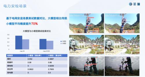 目前,圣瞳智巡大模型已在多个工业场景中得以落地应用,效果表现备受客户认可好评。例如,在煤矿行业的皮带跑偏场景中,圣瞳智巡大模型相比于小模型算法准确率提升约35%,场景泛化能力提升40%;在电网安监测领域,圣瞳智巡大模型相加比传统小模型平均精度提升70%,各项指标性能和综合实力表现完全领先。
