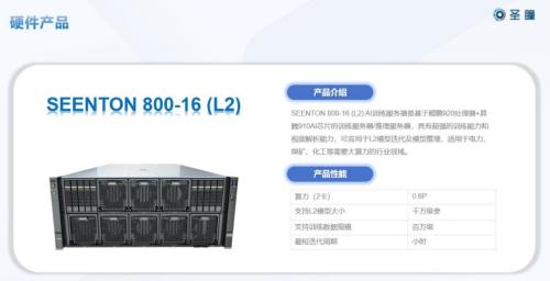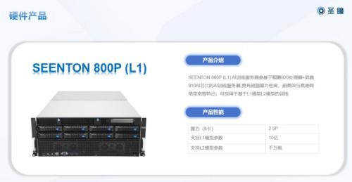 在硬件配置方面,SEENTON 800P (L1)是基于“鲲鹏920处理器+昇腾910AI芯片”的AI训练一体机,具有超强算力密度、超高效与高速网络带宽等特点,可应用于基于L1模型L2模型的训练,拥有2.5P算力,既支持10亿+参数级L1模型开发,也支持千万参数级L2模型开发。