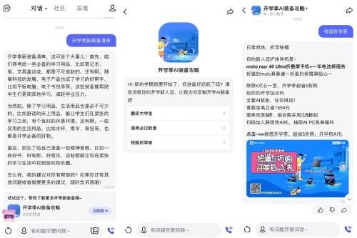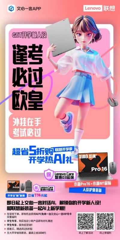 除此以外,联想还为“校园折学家”提供了手机无忧套装;为追求逢考必过的同学提供开学全“新”套装;为游戏头号玩家提供专属的超值游戏套装,套装购入至高可省1554元,对自己新学期人设迷茫的同学,也可以在文心一言APP上输入关键词找找独属自己的开学搭子。