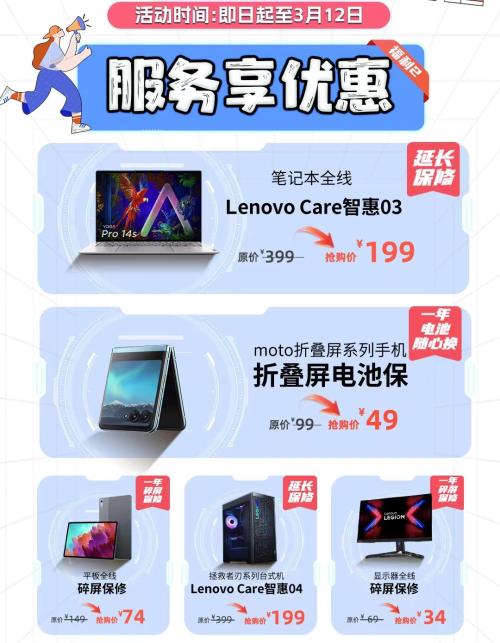 除了套装组合购的低价优惠,针对购买单品的同学,联想在超品日还推出了学生专享的5折优惠服务。Lenovo Care笔记本系列、拯救者刃系列台式主机延保服务原价399元,现在到手仅199元;平板、显示器全线可享受5折碎屏保修(一年);moto razr折叠屏系列手机可享原价99元,现价49元的电池保,一年可随心更换一次电池,让你的手机续航始终保持满血状态。