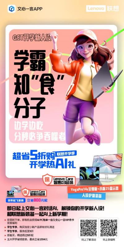 同时在活动期间,即3月12日之前,在联想官网购买任意一款AI PC即有机会获得双重惊喜,不仅可抽取免单机会,同时还可获赠文心一言App的VIP月卡,可尽情体验AI在学习中带来的效率升级。