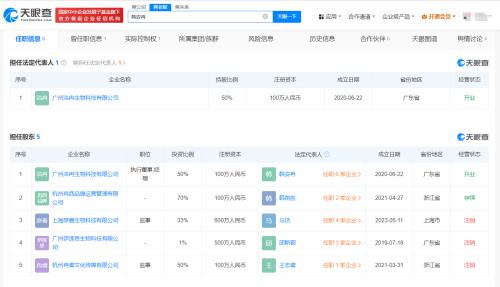天眼查App显示,韩安冉共关联6家企业,其中3家为存续状态,包括广州洁冉生物科技有限公司、杭州彦恩医疗美容诊所有限公司、杭州冉西品牌运营管理有限公司,涉及生物科技、医疗美容、品牌管理领域。韩安冉在上述3家公司担任执行董事、监事等职务,并在前2家公司持股。值得一提的是,韩安冉与前夫邱斯钿合开的广州伊莲恩生物科技有限公司已于去年6月被注销。