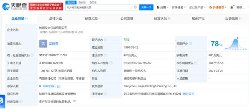 杭州俊杰包装有限公司成立于1998年3月,注册资本400万美元,经营范围为生产与销售塑料包装制品,现由宗馥莉、俊杰投资有限公司共同持股。值得一提的是,不久前,宗馥莉还接替父亲宗庆后,成为杭州萧山顺发食品包装有限公司股东,并任法定代表人、执行董事、经理。
