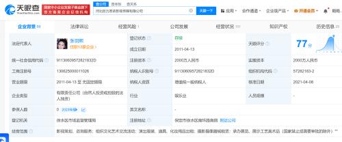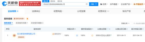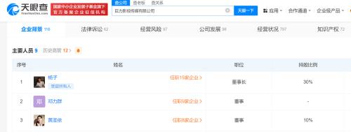 该公司成立于2011年4月,法定代表人为张羽熙,注册资本2000万人民币,经营范围含影视策划、咨询服务,组织文化艺术交流活动,演出服装、道具、化妆用品出租等。股权全景穿透图显示,该公司由巨力影视传媒有限公司全资持股,后者由杨子担任法定代表人、董事长,黄圣依担任董事,两人持股比例分别为30%、10%。