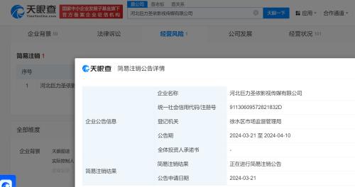 天眼查App显示,近日,河北巨力圣依影视传媒有限公司新增一则简易注销公告,公告期自3月21日至4月10日。