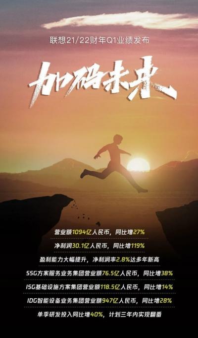 2021年8月11日——中国数字经济领导企业联想集团(HKSE:992)(ADR:LNVGY)公布截至2021年6月30日的2021/22财年第一财季业绩:营业额1094亿人民币,同比增长27%。净利润30.1亿人民币,同比增长119%。净利润率2.8%,达到多年以来的新高。联想集团再创史上最强的第一财季业绩。