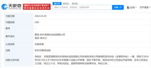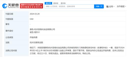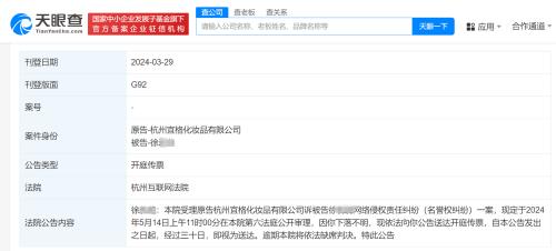天眼查法律诉讼信息显示,近日,因李某某、徐某某、程某某下落不明,杭州互联网法院分别向三人公告送达花西子关联公司杭州宜格化妆品有限公司与其网络侵权责任纠纷(名誉权纠纷)案件开庭传票,自公告发出之日起经过30日即视为送达,并定于5月14日公开审理3起案件。
